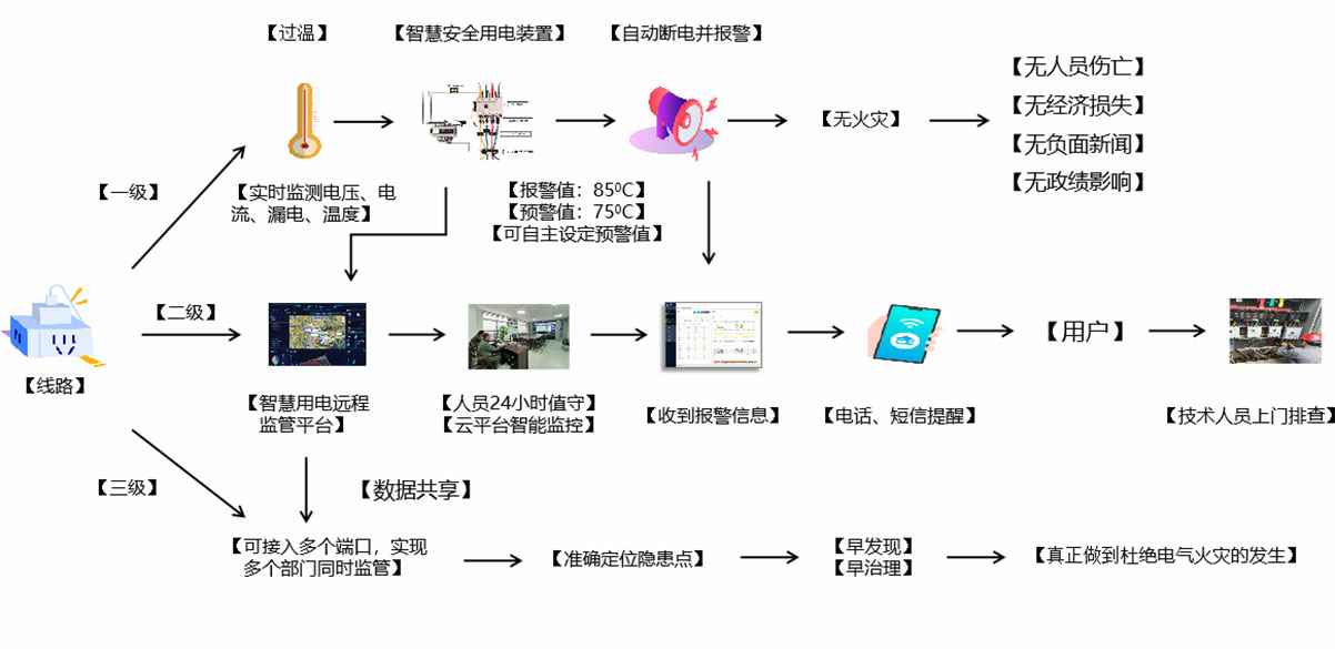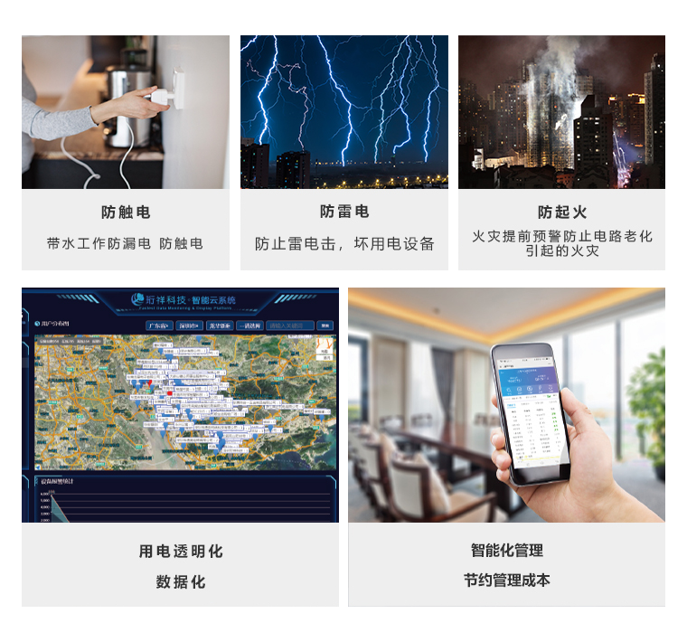 智慧断路器采用AI智慧安全物联网技术,通过智能探测器+防触电装置实时监测导线温度、电流、电压、漏电等数据,一旦发现有引发电气火灾的因素,系统将通过物联网云平台自动启动预警、断闸等防护措施并同时向多个用户终端(手机/电脑)发出预警信息,将电气安全隐患消除在萌芽状态,从源头上遏制电气火灾和触电事故的发生,让看不见、摸不着的电气安全隐患防得了,控得住!